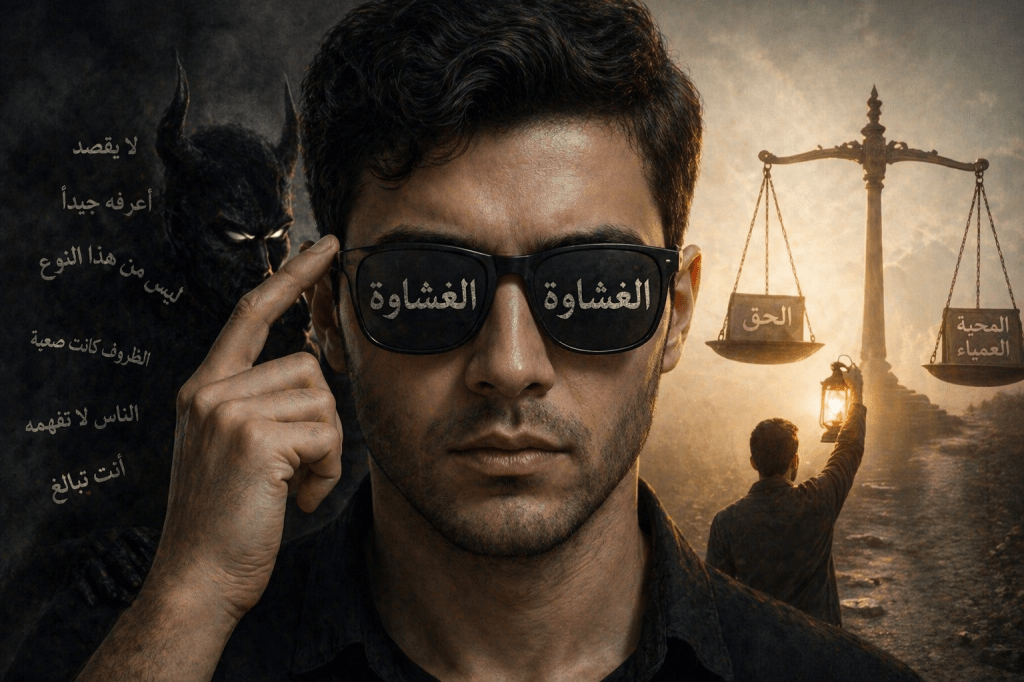 هنا تحولت المحبة من طاقة نور إلى طاقة ظلام، ومن قدرة على الانتشال من الخطأ، إلى الدفع إليه، والدفاع عنه، هذه النظارة السوداء ترتديها لأنك تخشى أن تنكسر أو تهتز صورة من أحببت أمامك، وتخشى أن تتغير العلاقة، فتختار الغشاوة وتحميها، وتدافع بشراسة عن النظارة السوداءـ، لن تسمح لها أن تسقط، وإلا سقَطَّت معها، حينها ينطبق عليك وصف “محبة الغشاوة”.